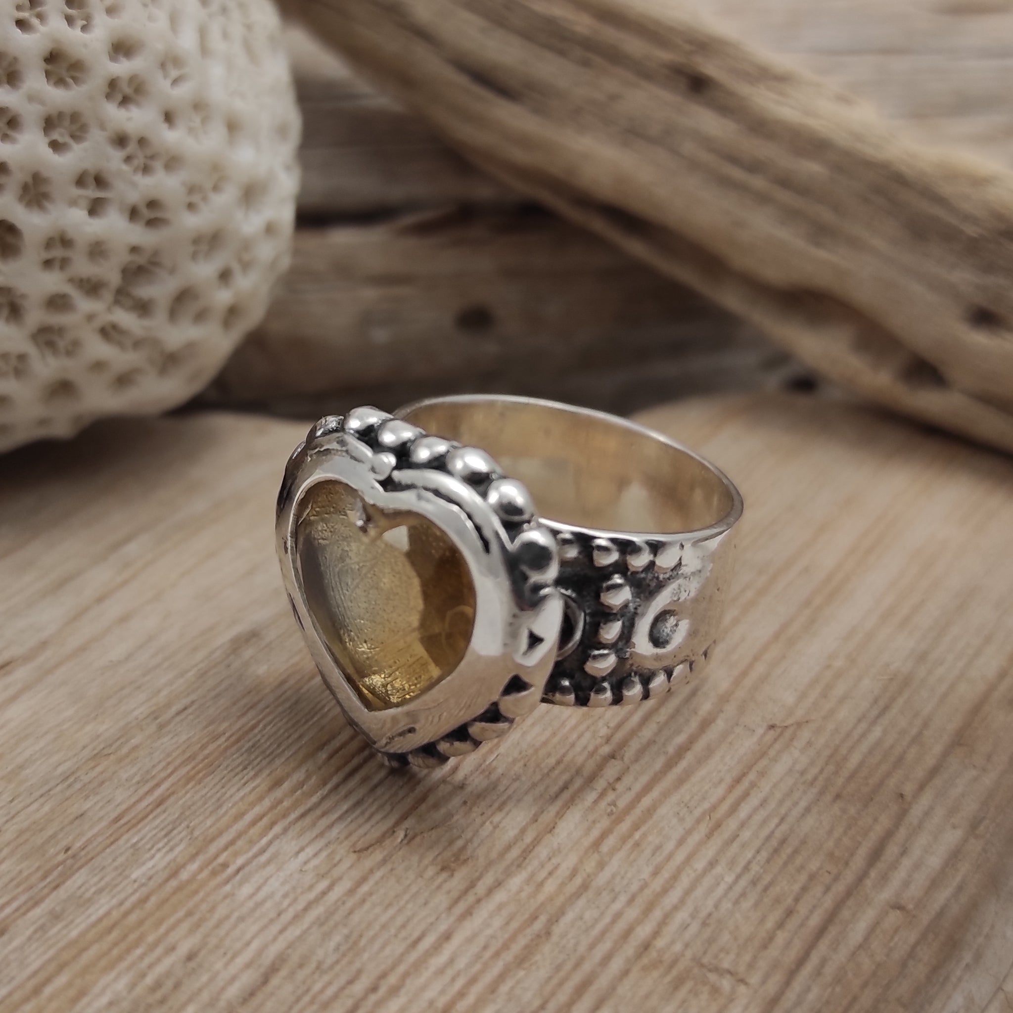 Anillo étnico de plata con piedras semipreciosas en forma de corazón. Joyas de diseño  de estilo boho chic.